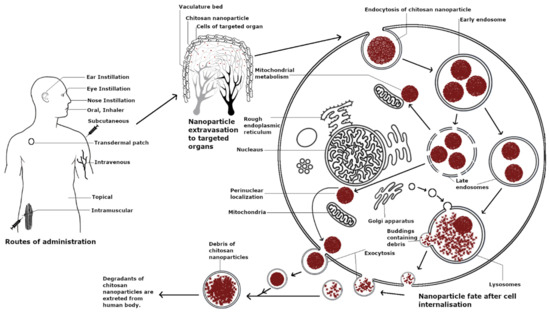 The nontoxic, biocompatible, and biodegradable properties of chitosan make it a polymer of choice for many biomedical and pharmaceutical applications. Chitosan microspheres and NPs for drug delivery were first reported in the late 1990s [1,2,3]. The chemical versatility of chitosan relies on its ability to form a poly-cationic charged molecule at physiological pH due to the protonation of D-glucosamine in its polymeric structure and its modifiable molecular weight [4]. Chitosan is a product of the deacetylation of chitin, and its chemical and biological properties are dependent on the degree of deacetylation and acetylation along with other factors such as molecular weight and types of surface modifications [5]. Chitosan has a pKa of 6.5, and it is insoluble in water but soluble in acidic solutions. The protonated species is capable of complexing with a diverse range of anionic biomolecules such as DNA, lipids, and proteins in the form of micro and nanoparticles by means of polyelectrolyte interactions leading to self-assembly. Chitosan NPs are used in a range of drug delivery applications from oral drug delivery to systemic cancer therapy for a variety of payloads including insulin, anticancer drugs, and gene delivery [6]. The biological interactions of chitosan NPs and its derivatives are principally governed by its physicochemical properties, such as size and charge [7,8,9]. The cationic nature of chitosan imparts mucoadhesive properties for mucosal drug delivery applications such as ocular and intranasal delivery. Chitosan NPs have improved the cellular uptake of therapeutics such as anticancer drugs and large molecules such as DNA and proteins [10,11,12,13]. Vaccines formulated with chitosan have high mucosal uptake and the activation of macrophages due to the mucoadhesive and adjuvant activity of chitosan [14]. The fate of chitosan at the cellular level determines its effectiveness in delivering these therapeutic molecules. Consequently, the passage of chitosan through the body and its elimination determines the effectiveness and subsequent toxicity of the therapeutic molecules that it is intended to transport.