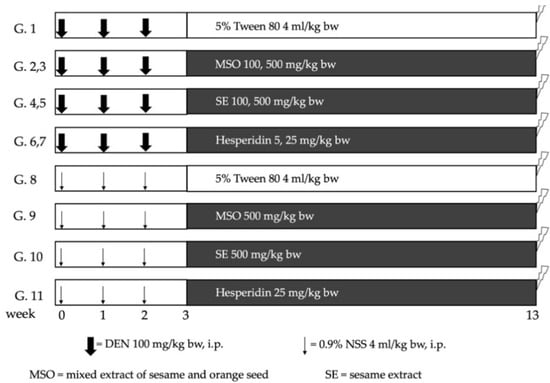 MSO at an amount of 100 mg/kg per bw was administered following the recommendations of the Thai FDA. The daily consumption amounted to 1000 mg/day [28]. The amounts of hesperidin and sesame extract given were equivalent to the amount in MSO. The primary objective of this study was to assess the effect of MSO and its compositions on the promotion stage of DEN-initiated hepatocarcinogenesis in six-week-old male rats. According to the study protocol, rats were randomly divided into 11 groups as is shown in Figure 1. During the first 3 weeks of the experiment, Groups 1 to 7 were intraperitoneally injected with 100 mg/kg per bw of diethylnitrosamine (DEN) once a week for 3 weeks, while Groups 8 to 11 were injected with normal saline solution. A week after the last injection, tested compounds were intragastrically administrated 5 days per week for 10 weeks. Groups 1 and 8, which served as positive and negative control groups, respectively, were fed with a 5% Tween-80 vehicle. Low doses of MSO, SE and hesperidin were intragastrically fed to Groups 2, 4 and 6, respectively. Groups 3 and 9 were treated with high doses of MSO, while Groups 5 and 10 received high doses of SE. Lastly, groups 7 and 11 were given high doses of hesperidin. Body weight, along with food and water intake values, were recorded twice a week. At week 13 of the experiment, all rats were euthanized by an overdose of isoflurane inhalation. Subsequently, whole blood was collected from their abdominal veins, while certain vital organs, including the liver, kidneys and spleen, were measured. Three pieces of a liver section were maintained in 10% formalin and the remaining frozen portion was kept in an −80 °C freezer for further immunohistochemistry and molecular analysis, respectively.