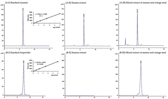 Chromatogram of sesamin (A) and hesperidin (B) in sesame extract and mixed extract of sesame and orange seed using HPLC.