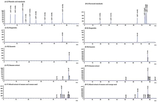 HPLC chromatograms of phenolic acids (A) and flavonoids (B) of standard hesperidin and sesamin, sesame extract and mixed extract of sesame and orange seed. Gallic acid (1), Protocatechuic acid (2), 4-hydroxybenzoic acid (3), Chlorogenic acid (4), Vanillic acid (5), Syringic acid (6), p-Coumaric acid (7), Ferulic acid (8) and Ellagic acid (9) were used as phenolic acid standards. The standard flavonoids were Catechin (1), Epicatechin (2), Rutin (3), Quercetin (4), Luteolin (5) and Apigenin (6).