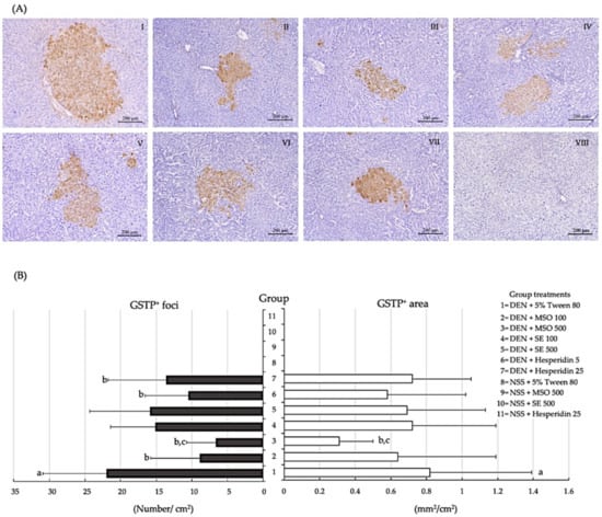 Effect of a 10-week administration of MSO and its compositions on the formation of GST-P-positive foci in rats. (A) Characteristics of hepatic GST-P-positive foci, Groups 1–8 are represented as I-VIII, respectively. DEN alone [I], DEN+MSO 100 [II], DEN+MSO 500 [III], DEN+SE 100 [IV], DEN+SE 500 [V], DEN+Hesperidin 5 [VI], DEN+Hesperidin 25 [VII] and a vehicle control [VIII]. (B) Number and area of GST-P-positive foci in rats. Values are expressed as mean ± SD. DEN: diethylnitrosamine; GST-P: glutathione S-transferase placental form; MSO: mixed sesame and orange seed extract; NSS: normal saline solution; SE: sesame extract. a significantly different from a negative control group, group 8 (p < 0.05). b significantly different from a positive control group, group 1 (p < 0.05). c significantly different from group 7 (DEN + Hesperidin 25) (p < 0.05).