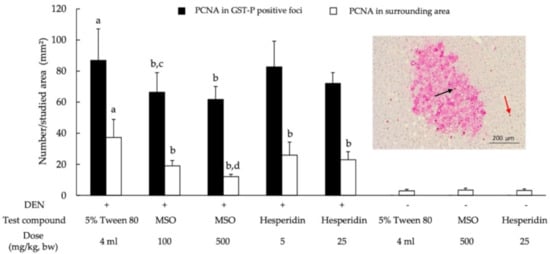 Effect of a 10-week administration of MSO and its compositions on cell proliferation in the livers of rat. Black arrow; PCNA-positive hepatocytes in GST-P-positive foci, red arrow; PCNA-positive hepatocytes in surrounding area. Values are expressed as mean ± SD. DEN: diethylnitrosamine; GST-P: glutathione S-transferase placental form; MSO: mixed sesame and orange seed extract; PCNA: proliferating cell nuclear antigen; a significantly different from a negative control group (p < 0.05); b significantly different from a positive control group (p < 0.05); c significantly different from group 6 (DEN + Hesperidin 5) (p < 0.05); d significantly different from group 7 (DEN + Hesperidin 25) (p < 0.05).