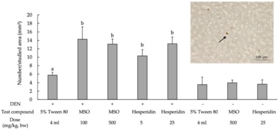 To study cancer preventive actions during the initiation stage of MSO and its active ingredients, four-week-old rats were separated into 10 groups. The DEN administration was introduced to Groups 1–5 and a vehicle solution was injected to Groups 6–10 according to the previously stated protocol. The oral administration of the test compounds was initiated 2 weeks before injections were given and feeding continued for 5 weeks. MSO at a low dose was given to Groups 2 and 7, while a high dose was fed to Groups 3 and 8. Low doses of hesperidin were administered to Groups 4 and 9, whereas low doses of hesperidin were fed to Groups 5 and 10. The sacrifice and sampling procedures were similar to those of the previous protocol.