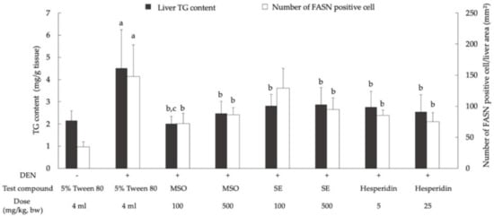 Effect of a 10-week administration of MSO and its compositions on hepatic lipogenesis in the livers of rat. Values are expressed as mean ± SD. DEN: diethylnitrosamine; FASN: fatty acid synthase; MSO: mixed sesame and orange seed extract; SE: sesame extract; TG: triglyceride; a significantly different from a negative control group (p < 0.05); b significantly different from a positive control group (p < 0.05); c significantly different from group 4 (SE 100) and group 6 (Hesperidin 5) (p < 0.05).