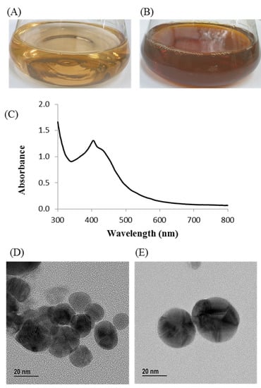 - Shankar, S.; Rhim, J.W. Amino acid mediated synthesis of silver nanoparticles and preparation of antimicrobial agar/silver nanoparticles composite films. Carbohydr. Polym. 2015, 130, 353–363. [Google Scholar] [CrossRef] [PubMed]