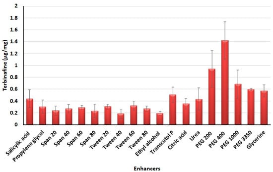 Nail clippings (2 mm × 2 mm) from human volunteers were weighed, soaked in 2 mL solution of the drug (10 mg/mL), and 20% w/w enhancer (citric acid, ethyl alcohol, glycerin, PEG 1000, PEG 200, PEG 3350, PEG 400, propylene glycol, salicylic acid, span 20, span 40, span 60, span 80, transcutol P, tween 20, tween 40, tween 60, tween 80, and urea) for a duration of 24 h. The nail was taken out and the surface drug was cleaned by following a standardized procedure. In brief, the nail surface was scrubbed by applying a cotton sponge (wetted in 95% ethanol) and flushed with 1 mL ethanol, and the whole process was repeated 5 times. The surface of the nail plate was wiped, the weight of each nail was recorded and dissolved in sodium hydroxide solution (1 M, 1.5 mL). The drug was separated according to the method reported previously [37]. Briefly, the dissolved solution of nails in the vials was neutralized by adding hydrochloric acid (5 M, 200 µL). The extraction of terbinafine to hexane (3 mL) was performed by manually shaking the vials for 30 min. To complete the extraction, the mixture was centrifuged at 5000 rpm for 8 min. The supernatant layer was separated and added isopropyl alcohol: sulfuric acid (15:85, 1 mL) and stirred for 30 min. The bottom layer, which comprises the larger concentration of the drug, was collected separately and analyzed by HPLC.
