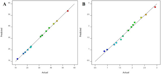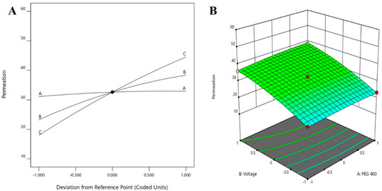 The positive coefficients of all the three model terms (i.e., A, B, and C) represent an increase of permeation with the increase in PEG 400 concentration in the formulation, and also with the application time and applied voltage. The influence of each independent variable is indicated in Table 4 where all the model terms are significantly affecting the permeation; however, the influence of model term C (i.e., application time) shows the highest when compared to the others (i.e., A and B), which is reflected by the highest coefficient value of C (13.28) when compared to the coefficient value of respective model terms in the Equation (1). At the same time, the coefficient value of model term B (7.55) is higher than the coefficient value associated with model term A (0.9063), which represents a higher effect of B (voltage) when compared to model term A (PEG 400) on nail permeation. A similar impact of the independent variables on the permeation of the drug was illustrated in the perturbation plot (Figure 2A) and the 3D surface plot (Figure 2B). It is well understood from the figures that the effect of all the three independent variables coincides with the previous explanation on the quadratic equation. In addition, the comparison of predicted and actual values of this analysis has been presented in Table 2 and Figure 3A, where the closeness of the actual and predicted values are noticeable. On the other hand, from the contour plot response, it is evident that the changes in permeation of the drug via the nail are much more promising when the applied voltage was increased than the increase in PEG content in the formulation (Figure 4A). Contrarily, the application time shows the highest impact on the permeation of the drug when compared to the applied voltage (Figure 4B). Our findings on increased permeation with the increase in PEG 400 content in the formulation is in close agreement with the existing literature [26,31,46,51], whereas an increase in voltage application during the iontophoresis process had been established for a direct relationship with permeation [52]. Moreover, the application of a constant voltage at particular nail resistance will eventually provide a constant current for the transport of drugs into and through the nail plate. Similarly, the application time of the product at the site of the application is also having a direct relationship with the permeation of the drug in the formulation [47,48].