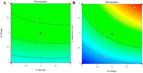Contour plot response displaying the effect of independent variables on the permeation of drug (A) voltage versus PEG 400 and (B) application time versus voltage.