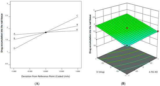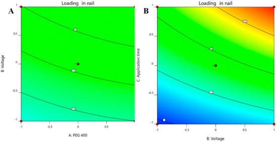 The multilinear equations relating to coded factors are employed in carrying out predictions about the response for given levels of individual factors. The coded equation is beneficial for assessing the comparative effect of the factors by relating the coefficient values. The positive coefficients of all the three model terms (i.e., A, B, and C) in Equation (2) represent an increase in drug accumulation into the nail tissue with the increase in PEG 400 content in the formulation, and also with increasing application time and applied voltage. The influence of each independent variable is indicated in Table 5 where all the model terms are found to be significantly affecting the drug accumulation (p < 0.05); however, the influence of model term C (i.e., application time) shows the highest (0.6738) coefficient value in the Equation (2) when compared to the others (i.e., 0.0865 and 0.2846 for A and B, respectively), which indicated the maximum response on drug accumulation into the nail tissue with changes of model term C. On the other hand, the model term B shows a higher effect when compared to model term A, which is indicated by their respective coefficient values in Equation (2). A similar influence of the interaction of independent variables on the drug accumulation into the nail tissue was depicted in the perturbation plot (Figure 5A) and the 3D surface plot (Figure 5B). It is well understood from the figures that the effect of all the three independent variables coincides with the previous explanation on the quadratic equation. In addition, the comparison of predicted and actual values of this analysis has been presented in Table 2 and Figure 3B, where the closeness of the actual and predicted values are noticeable. On the other hand, from the contour plot response, it is evident that the changes in drug accumulation into the nail tissue are much higher with the rise in applied voltage when compared to the increase in PEG content in the formulation (Figure 6A). Contrarily, the application time has shown a higher impact on the drug accumulation into the nail tissue when compared to the applied voltage (Figure 6B). Our findings on increase in drug accumulation into the nail tissue with the increase in PEG 400 content in the formulation have also been demonstrated in the reported literature [46]. Furthermore, the application of increased voltage during the iontophoresis process has been established to have a direct relationship with drug accumulation into the nail tissue [55]. Similarly, the duration of application of the formulation at the site is also having a direct relationship with the drug accumulation into the nail tissue [37].