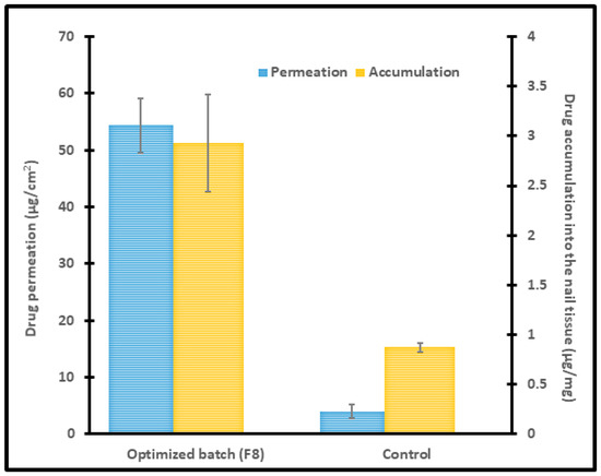 The obtained experimental data for optimized batch (F8) on the drug permeability and drug accumulation into the nail tissue were presented in Figure 7, which are in close agreement with the predicted values with a difference of 1% and 2.3%, respectively. A significant enhancement in permeation and drug accumulation was noticed by the optimized batch, signifying the potential of constant voltage iontophoresis in transungual drug delivery. Moreover, it has been demonstrated that the drug permeation and accumulation into the nail tissue did not differ among the diseased and healthy nails [57]. Hence it is presumed that the data observed here could be translated into onychomycotic nails.