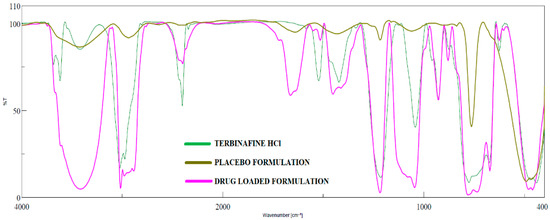 Spectra of terbinafine, placebo, and chosen formulation (F8) were recorded using the FTIR spectrometer (6100, Jasco, Tokyo, Japan). The liquid samples were prepared by diluting with the required quantity of chloroform and the sample (0.1 mL) was injected into the spectrometer. A total of 32 scans were taken per sample at a resolution of 16 cm−1 and the IR spectra were developed in the range of 400–4000 cm−1.