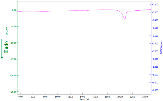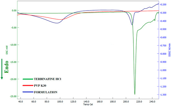 The thermal behavior of terbinafine, PVP K30, and selected formulation (F8) was assessed using DSC (Hitachi DSC 7020, Tokyo, Japan). Weighted samples (5 mg) were kept in aluminum pans and secured non-hermetically, while a blank pan was taken as a standard reference during the study [41]. Thermograms were recorded at a particular heating rate (10 °C/min) under a nitrogen atmosphere with a heating range of 30–250 °C.