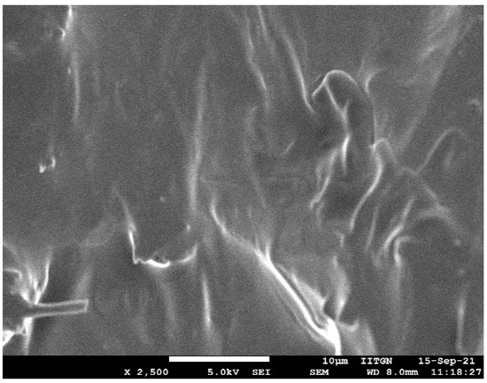 SEM micrograph of formulation F8 is depicted in Figure 10. Visual observation of the image indicates complete miscibility of terbinafine with the formulation components and no visible presence of drug crystals. The film-like structure displayed in the image could be probably because of the polyvinylpyrrolidone K 30 present in the formulation. The non-uniformity in the surface could be likely due to the aggregation of formulation ingredients, and may not essentially represent the hydrated product as described in the literature [61].