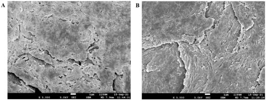 Scanning electron microscopy images of (A) treated nail plate (iontophoresis, 12 V for 6 h using formulation F8) and (B) control nail (passive, 0 V for 6 h using formulation F8).