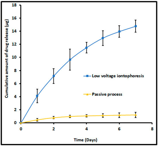 The release of terbinafine from the drug encapsulated nail plates is of prime importance. It is a well-known fact that the retention of drugs in the nail plate and its subsequent release is considered a crucial factor, particularly for topical nail products. This is mainly because the drug depot in the nail plate ultimately releases into the nail bed, where the organism resides. Therefore, the ex vivo release experiments were conducted for nail plates comprising terbinafine by iontophoresis (12 V for 6 h) or passive (0 V for 6 h). The release profiles of terbinafine from nails accumulated by iontophoresis and passive process were shown in Figure 12. Two distinct release profiles were observed for nails accumulated with terbinafine by iontophoresis and passive process. A greater amount of drug release (p < 0.0005) was noticed in nails accumulated by iontophoresis as compared to nail accumulated by the passive process in the current experimental conditions. In addition, the nails accumulated with terbinafine by iontophoresis, the release rate was high during the first day demonstrating a maximum amount released as 4.12 ± 1.04 µg, and decreased steadily further with duration and released ~0.8 µg at day seven (Figure 12). The rationale for this high drug release rate in the initial period could be directly attributed to the existence of a relatively higher amount of free terbinafine in the nail plate, which eventually diffused out [37]. Followed by the free drug release, the drug molecules embedded in the nail or bound to the keratin occurred. The total amount released at the end of seven days was 14.76 ± 0.92 µg, which represents ~40% of the total drug accumulated in nail plates (based on the average value of drug accumulated in nail plates found in batch F8 during iontophoresis). These results signify that a higher payload of the drug could be released from the depot formed in the nail matrix into the nail bed by iontophoresis application. However, the cumulative drug release from the nail accumulated by the passive process was considerably low (1.23 ± 0.41 µg in 7 days), in addition to the slow release rate observed throughout the study period. This less amount of drug release could be directly related to the total drug accumulation in passive delivery, which itself is considerably low, and is consistent with earlier studies [38]. In general, ex vivo release results disclosed that there was a pronounced release of the drug across the nail plates when the drug was accumulated by iontophoresis and was statistically significant (p < 0.005) when compared to the release of the drug across the nails when the drug was accumulated by passive delivery. Thus, the release occurring across the nails from the drug accumulated by iontophoresis is likely to provide continuous release of drug over at least a week and could serve to bathe the nail bed in clinical situations that could reduce the frequency of topical therapy, though need to be investigated in vivo.