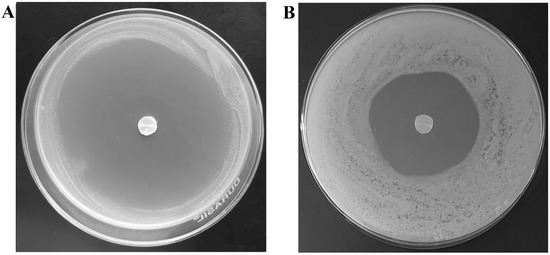 Photographic images showing antifungal efficacy by the drug-accumulated nail plates at day 4 by (A) iontophoresis and (B) passive process. The drug accumulation into the nail tissue was done with optimized formulation (F8) using iontophoresis (12 V for 6 h) and passive process (0 V for 6 h).