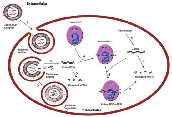 General illustration of siRNA/miRNA gene silencing mechanism: (1) siRNA-LNP complex enters target cell via endocytosis: (2) endosome is unpackaged, and siRNA escape from endosome to the cytosol, avoiding lysosomal degradation; (3) lysosomal degradation occurs; (4) free siRNA loaded onto RISC; (5) siRNA degraded in the cytoplasm; (6) active RISC formed with target mRNA; (7) target mRNA cleaved by RISC; (8) transcription rate of mRNA; (9) degradation of mRNA. LNP: lipid nanoparticle; RISC: RNA-induced silencing complex, a ribonucleoprotein complex functioning in gene silencing. Reproduced with permission from Mihaila, R. et al., Mol Ther Nucleic Acids; published by Elsevier, 2017 [32].