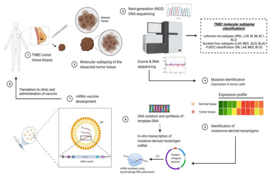 Molecular targets using RNA-based immunotherapies are characteristically different from those discussed for RNAi, where instead of targeting dysregulated proteins, antigenic substances present on tumors are instead targeted to elicit host immune responses [50]. Immunotherapeutic targets in TNBC are generally characterized as TAAs, and among the most prominently over-expressed antigens on TNBC tumors are cancer-testis (CT) antigens, which are preferentially expressed as a result of epigenetic changes [51]. There have been over 150 CT antigens documented thus far, among which MAGE-A, NY-ESO-1, FOXM1, ATAD2, and SPANXB1 present as common features of TNBC [51,52,53,54]. Other TAAs commonly associated with TNBC include mesothelin (MSLN), mucin 1 (MUC1), folate receptor alpha (FOLR1), and trophoblast cell surface antigen 2 (Trop2) [53,55]. Immunotherapeutic strategies that can be used to target TAAs can include the use of naked monoclonal antibodies (mAbs), immunoconjugates (including immunotoxins and drug-conjugated mAbs), oncolytic virotherapy, CAR-T cell therapies, or mRNA cancer vaccines, including those approaches previously mentioned above. Figure 3 below describes the application of TAAs in the development of mRNA vaccines for TNBC. Initially, TAAs are first identified in resected tumor tissue through molecular subtyping and sequencing. After this, mutanome-derived neoantigens are identified to begin mRNA vaccine development, which eventually leads to clinical translation of the vaccine and administration to the patient.