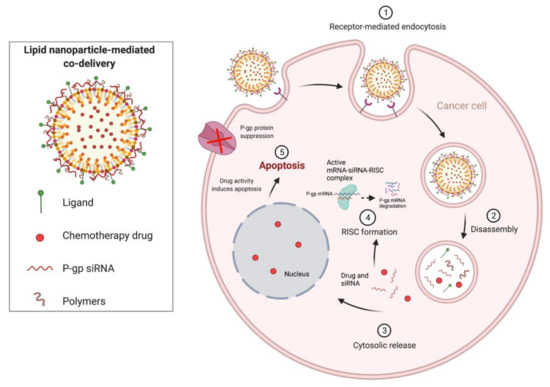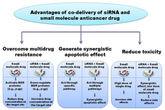 Combination cancer therapies can be used to improve the efficacy and safety of current treatments utilizing small-molecule anticancer drugs, as well as amplifying the effects of RNAi. Further, combinatorial therapeutic approaches can also be used to overcome multidrug resistance (MDR), a considerable challenge in cancer treatment. Co-delivery of RNAi and anticancer drugs can produce a synergistic effect that can lead to improved treatment efficacy. As shown in Figure 5 below, siRNA targeting P-glycoprotein (P-gp), an efflux protein that mediates MDR, in combination with an anticancer agent can lead to therapeutic synergism, where P-gp siRNA inhibits expression of P-gp, and the anticancer agent causes apoptosis.