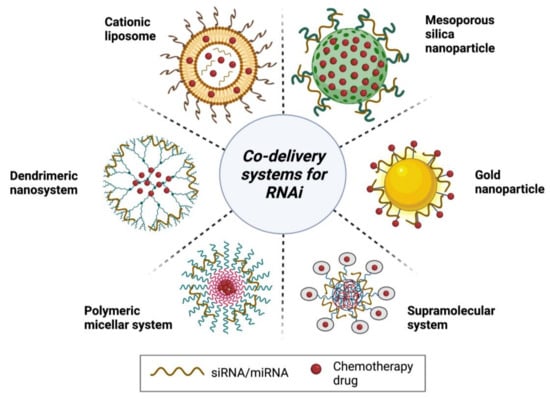 As illustrated in Figure 7, co-delivery systems are formulated similarly to therapeutic delivery vehicles used by RNAi, where dendrimers, micelles, inorganic NPs, and supramolecular assemblies such as liposomes and other bioengineered systems are also utilized to deliver RNAi and anticancer drugs. Importantly, the composition of these co-delivery systems depends on various physicochemical characteristics that must be individually considered. For example, Figure 7 shows the difference in the specific orientation of the chemotherapy drug to the siRNA. This characteristic is unique to each delivery system and is dependent on several factors including the hydrophilicity of the drug, electrostatic interactions between the charged RNA, and the surface chemistry and chemical stability of the delivery vehicle, including its surface functionality and charge. Consideration of all these factors is an important step to ensuring the successful development of a delivery system that enhances the therapeutic effect of the combination therapy, by increasing its bioavailability, chemical stability, and specificity, among other qualities.