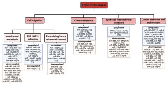 Diversity of select miRNAs contributing to TNBC invasiveness [14,69,70,71,72,73]. Adapted from [74].