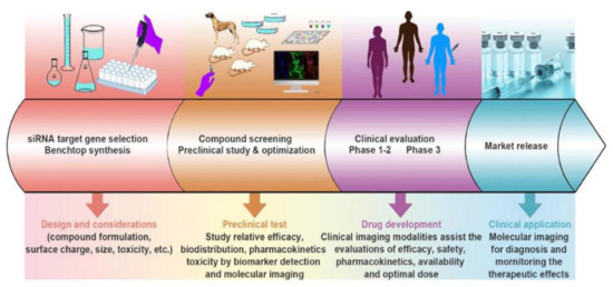 There has been significant progress in developing RNA-based therapies for a wide variety of diseases, although primarily preclinically for TNBC to date. Although there are several promising early-stage studies for TNBC using RNAi and RNA immunotherapy as was described in Section 1.3, and combinatorial RNA-based therapies, described in Section 1.4, it is important to recognize that there is still a significant amount of work until these therapeutic agents/strategies will advance to clinical evaluation. As shown in Figure 9, preclinical studies are currently the second of the four-step workflow process of developing RNAi (and other RNA-based) therapeutics and translating them for clinical applications. While there is still considerable time before these studies are advanced to the patients, the significant progress that has been made recently is certainly promising and serves to demonstrate the rapid developments that have contributed to TNBC treatment thus far.