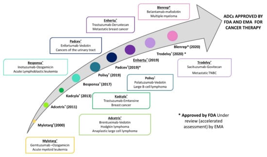 Timeline of the ADCs that have been approved by the Food and Drug Administration (FDA) and the European Medicine Agency (EMA) and are currently available in USA and the European Union for cancer therapy.