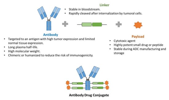 ADCs may represent an ideal treatment chemotherapeutic option in cancer disease: selective and effective with cancer cells. They combine the tumor-selective activity of monoclonal antibodies and the effective cytotoxic effect of chemotherapy with a lower rate of the undesirable side effects of antineoplastics, and, in some cases, a higher efficacy, due to tumor specificity. They consist of three components: (i) a tumor antigen-selective monoclonal antibody, (ii) a potent antineoplastic agent, and (iii) a linker that binds these two entities (Figure 2) [,]. Regarding the general mechanism of action, ADCs bind to their specific target that is expressed on the surface of cancer cells, and are internalized by a receptor-mediated endocytosis. Then, the antineoplastic drug is released and exerts its anticancer activity [,]. Some antibodies have also an antitumor effect per se which improving the overall antitumor efficacy []. This is the case of trastuzumab, approved for the treatment of human epidermal growth factor receptor-2 (HER-2) positive breast and gastric tumors [], and that it is present in two approved ADCs: Kadcyla® and Enhertu®. Trastuzumab exerts its anticancer effect by inhibiting the proliferation induced by HER-2, as when it binds to these receptors, it blocks its auto-activation and promotes its degradation, and by activating antibody-mediated cytotoxicity [].