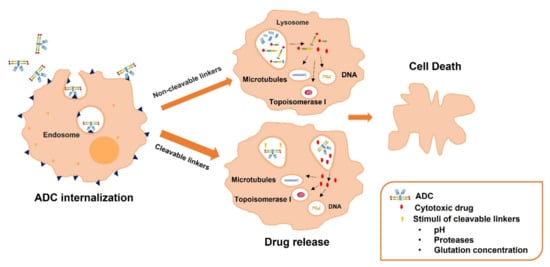 Regarding linkers, they are used to connect the payload molecules to the monoclonal antibody, through their disulphides, hydrazones, and thioethers groups, influencing the stability of the ADC [,]. The used linkers should comply with two requirements: to have sufficient stability to allow prevent premature cleavage in the bloodstream and to be rapidly cleaved after ADC internalization to release the antineoplastic [,,]. There are two different categories based on the release mechanism of the antineoplastic: cleavable and non-cleavable linkers. The release mechanism of cleavable linkers is based on several characteristics of the physiological environment: (i) low pH values of the intracellular compartment compared to the neutral pH of the extracellular compartment (acid-labile linkers), (ii) the presence of proteases that release the drug at the area of junction (protease-cleavable linkers) and (iii) the high glutathione concentrations that reduce disulphide bridges (disulphide-linkers) []. On the contrary, for non-cleavable linkers, there is no inbuilt chemical trigger to break the linker and release the cytotoxic payload. After ADC internalization in the target cells, the monoclonal antibody is metabolized by the lysosomal proteolytic machinery into aminoacids, triggering the release of the antineoplastic bound to the linker and the amino acid appendages [] (Figure 3). It should be considered that the ADCs developed using non-cleavable linkers are more stable. Moreover, this release mechanism prevents a premature drug release, reducing systemic toxicity []. Nevertheless, it is required and efficient internalization and lysosomal trafficking. This release mechanism could also affect the drug effect, specially comparing with the use of cleavable linkers. In fact, the most used linkers in ADCs are cleavable linkers: acid-cleavable linkers, protease-cleavable linkers (specially cathepsin cleavable-linkers), and disulfide-containing-reducible linkers [].