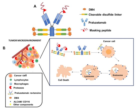 Praluzatamab ravtansine, also known as CX-2009, is another developed ADC that contains DM4 as payload, in this case, linked, via a cleavable disulfide linker, to praluzatamab, a monoclonal antibody targeting the activated leukocyte cell adhesion molecule (ALCAM/CD116), a glycoprotein overexpressed by certain tumors and that is involved in tumor progression []. This formulation is of special interest from a structural point of view. With the aim of avoiding the binding of this monoclonal antibody to the CD116 antigen expressed in healthy cells, the binding area of this antibody is masked by a cleavable peptide, that is degraded by tumor-associated proteases that are specifically found in the tumor microenvironment. Then, the monoclonal antibody binds to the CD116 antigen of the surface of tumoral cells, the ADC is then internalized and DM4 payload is released intracellularly (Figure 4). A study undertaken in a mouse model of lung cancer overexpressing CD116 antigen with 89Zr-radiolabeled formulation has demonstrated a selective targeting at the tumoral level and a reduced accumulation at healthy tissues, indicating that this masking strategy is useful to decrease the toxicity and to improve the efficacy of this formulation []. This ADC has been mainly evaluated in breast cancer patients. However, a study carried in patients with several types of advanced carcinomas, also included ovarian cancer patients (NCT03149549). Preliminary results of this study demonstrated a partial response in ovarian cancer-treated patients, just 9% of the women demonstrated a partial response, indicating a poor effect in this neoplasm. Regarding the toxicity, the formulation was in general well tolerated, being fatigue, nausea, vomiting, arthralgias, and infusion-related reactions were common adverse effects. Ocular toxicities were also detected in some patients []. It should be mentioned that this study included a small cohort of ovarian cancer patients, and further investigation is probably needed to evaluate verify the potential utility of praluzatamab ravtansine in advanced ovarian tumors, especially considering the lack of effective treatments for this disease.