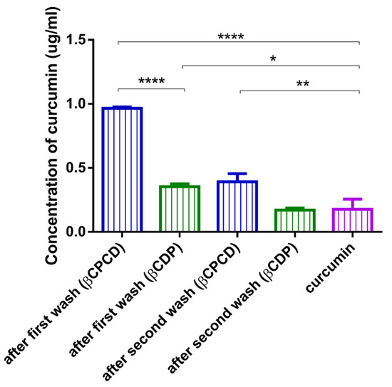 After incubation of excess amounts of curcumin with 10.0 m/m % βCDP and βCPCD solutions for 24 h, the supernatant was removed and the solid sedimented phase was further washed and incubated with purified water in two washing steps for 24 h in each step. The solubilized curcumin in the supernatant after each wash was determined and compared to the curcumin dissolved without cyclodextrin polymers (data are presented as means ± SD, n = 3. Labels of the significant differences are the following: **** p < 0.0001, ** p < 0.01, * p < 0.05).
