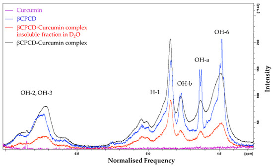 Comparison of 1H NMR spectra in DMSO-d6 of curcumin (purple), βCPCD (blue), insoluble fraction in D2O of βCPCD–curcumin mixture (red) and βCPCD–curcumin mixture (black) at 6.00–4.30 ppm.