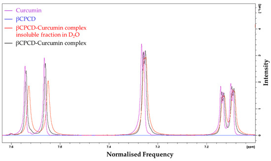 Comparison of 1H NMR spectra, in DMSO-d6 of curcumin (purple), βCPCD (blue), insoluble fraction in D2O of βCPCD–curcumin mixture (red) and βCPCD–curcumin mixture (black) at 7.60–7.10 ppm.