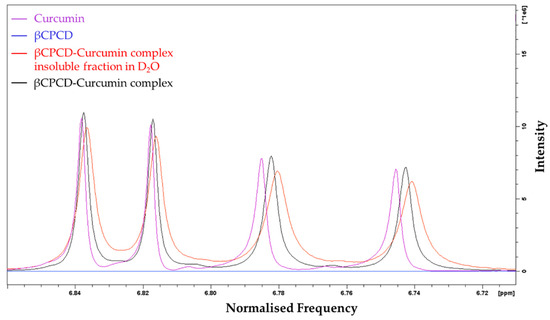 Comparison of 1H NMR spectra, in DMSO-d6 of curcumin (purple), βCPCD (blue), insoluble fraction in D2O of βCPCD–curcumin mixture (red) and βCPCD–curcumin mixture (black) at 6.86–6.71 ppm.