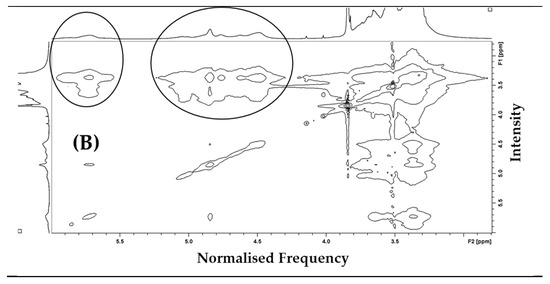 Comparison of 2D NMR NOESY spectra of βCPCD (A) and βCPCD–curcumin mixture (B) in DMSO-d6 at 6.00–2.80 ppm.