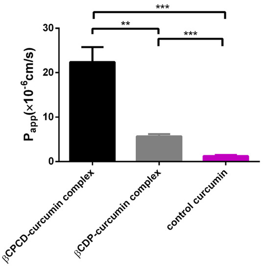 Permeability of curcumin on Caco-2 monolayers treated with curcumin–cyclodextrin complexes. Cyclodextrin polymers significantly increased Papp of curcumin (data are presented as means ± SD, p < 0.0005, n = 3; *** p < 0.0005, ** p < 0.01 based on ANOVA) (Papp—apparent permeability coefficient).