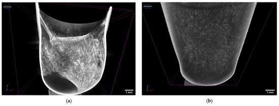 The images of microCT scans performed on curcumin–cyclodextrin polymer complexes formulated into hard gelatin capsules are presented in Figure 10. The capsule formulations were prepared by lyophilization, and the complexes showed different structures after removal of the solvent. The cyclodextrin polymer complex formed by βCPCD showed a highly porous structure with filaments (Figure 10a); in contrast, the other complex (curcumin–βCDP complex) created a porous but granular structure with higher density.