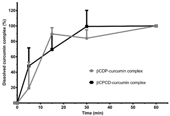 Dissolution curves of hard gelatin capsules filled with curcumin–cyclodextrin polymer complexes (data are presented as means ± SD; n = 3).