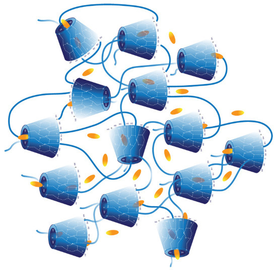 Schematic representation of βCPCD–curcumin complex. The yellow-colored curcumin molecules are entrapped in the β-CD cavity and in the 3D cross-linked area.