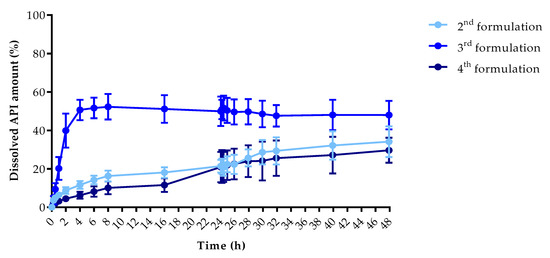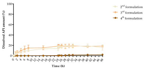 | Sampling Time (h) | Dissolved API (%) | ±SD | Dissolved API (%) | ±SD | Dissolved API (%) | ±SD | Dissolved API (%) | ±SD | Dissolved API (%) | ±SD | Dissolved API (%) | ±SD |