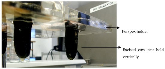 Teats were excised from the mammary glands of slaughtered cows and transferred immediately to our lab. They were mounted in a purpose-made frame maintained in a vertical position (Figure 1). Whole cow milk (2 mL) was introduced to each teat. Immediately thereafter, 3 mL of each polymer/solvent blend formulation was infused into the teat cistern via the streak canal and left for 3 and 12 h while shaking at 50 rpm at room temperature. Teats were cut open (at two time points of 3 and 12 h) and evaluated for evidence of in situ gelling of the formulations. In addition, the mucosal tissue in direct contact with the formulation was inspected for any undesirable events (redness, inflammation, pallor and necrosis). Each polymer blend (HPMC 1, HPMC 2, CMC 1, CMC 2, ALG 1 and ALG 2) was investigated in triplicate.