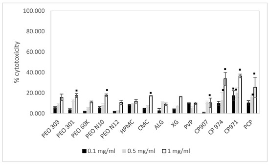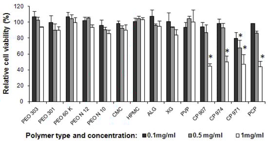 At a lower concentration of 0.5 mg/mL, the cell viability following incubation with PEO, CMC, HPMC, ALG, XG, PVP, CP 907, CP 974 and PCP was comparable with the negative control. On the other hand, CP 971 at this concentration induced a significant (p < 0.05) reduction in cell viability to ~68% of control.