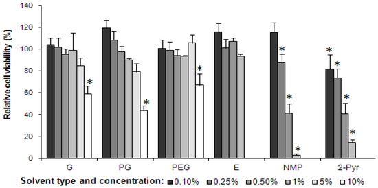 MAC-T cell viability in various concentrations of different solvents after 72 h. Black, various grades of grey and white bars depict the concentration of each solvent ranging from 0.1, 0.25, 0.5, 1, 5 and 10%. Cell viability was detected by MTT assay and expressed as a percentage of viability of untreated control cells (mean ± SD, n = 3). The standard deviation is shown by the error bars. * denotes significance from negative control. (Legend: glycerin (G), propylene glycol (PG), polyethylene glycol 400 (PEG), ethanol (E), N-methyl-2-pyrrolidone (NMP) and 2-pyrrolidone (2-Pyr).