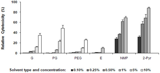 In the LDH assay, a similar concentration-dependent cytotoxic effect was observed for the solvents after a 72 h incubation period with MAC-T cells (Figure 7). PG appeared to be more toxic compared to G and PEG. The LDH release due to PG at 10% concentration was ~50% compared to 33% for G and 22% for PEG. On the other hand, 2-Pyr and NMP were highly toxic at 1% concentration where the membrane damage and enzyme leakage caused by 2-Pyr was over 80% and ~65% from NMP. Ethanol did not show any significant toxicity in MAC-T cells at the concentrations used in this study.