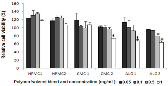 The addition of water (Table 1) to the polymer/solvent mixture is pivotal to induce the desirable sol-to-gel phase change and the subsequent emergence of previously described microstructures [22]. Consequently, the biocompatibility of the formulations was evaluated. Results obtained with the MTT assay showed that formulations HPMC 1, HPMC 2 and CMC 1 did not reduce MAC-T cell viability up to a concentration of 1 mg/mL. On the other hand, a concentration-dependent reduction in cell viability was demonstrated by CMC 2, ALG 1 and ALG 2. At 1 mg/mL concentration a significant reduction in cell viability was produced by these formulations (Figure 8). At a concentration of 0.5 mg/mL, cell viability was not affected by any of the formulations except ALG 2.