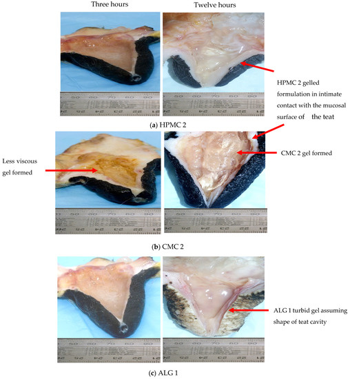 A comparison of HPMC, CMC and ALG formulations revealed that gels formed from formulations comprising cellulose derivatives were more viscous and firmly set compared to those formulated using ALG. In addition, these gels were transparent and clear, indicating a homogeneous mixture of excipient and solvents. The gels formed from the two ALG 1 and ALG 2 suspensions were similar in consistency and appeared to be the least viscous compared with those based on CMC and HPMC. At twelve hours, ALG gels, although set, appeared turbid, indicating possible microbial growth or phase separation. Nevertheless, both ALG 1 and ALG 2 appeared firmer at twelve hours than at three hours, where they assumed shape of the teat cistern.
