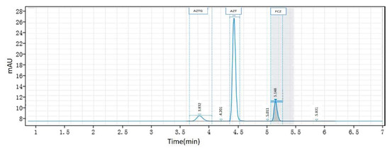 The HPLC analysis was performed on an Agilent 1260 infinity (G7117C, Agilent, 5301 Stevens Greek Blvd., Santa Clara, CA, USA) coupled to a UV/Vis detector. The detection wavelength was 267 nm. A ZORBAX Eclipse XDB-C18 column (2.1 × 150 mm; 5 μm) (Agilent, Santa Clara, CA, USA) was used for separation with a flow rate at 1 mL/min, and the injection volume was set to 10 μL. The column temperature was kept at 25 °C. The mobile phases comprised (A) 0.2% acetic acid in 100% water and (B) acetonitrile. Elution was carried out by the gradient method as follows: 5% B kept for 2.0 min, followed by a linear increase to 20% B during 1.5 min and maintained at 20% B for 2.0 min, then linearly decreased to 5% B in 0.5 min and maintained for 1 min. The intra-day precision and accuracy were assessed by testing the QC (quality control) samples (AZT: 15, 400 and 1500 μM; AZTG: 1.5, 25 and 150 μM; FCZ: 75, 1500 and 8000 μM) each day, and the inter-day precision and accuracy were estimated by analyzing the QC samples over three consecutive days. Five samples were determined in each concentration level. The requirements were as follows: the coefficient of variation (CV%) should not exceed 15%, and the relative error (RE%) should be within 85–115%.