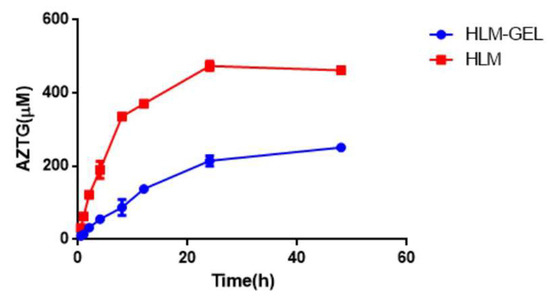 The metabolism of AZT within 48 h after the microsomes encapsulated in the hydrogel is shown in Figure 4. The results indicated that there was a delay in metabolism after the microsomes were encapsulated in the hydrogel. The amount of the produced AZTG basically reached equilibrium within 48 h in the traditional HLM experiment, while it still showed a slight upward trend in the HLM-Gel experiment. This indicates that it takes a certain period of time for the drugs to diffuse into the hydrogel, before they contact with the microsomes to undergo the metabolic reaction in the HLM-Gel system. Moreover, the microsomes encapsulated by the hydrogel may retain their activity for a longer time. Therefore, the incubation time of the HLM-Gel experiment should be prolonged compared with that of the traditional HLM experiments. As shown in Figure 4, the formation of AZTG increased linearly within 0.5–8 h in a traditional HLM experiment, while it increased linearly within 24 h in the HLM-Gel experiment. The reaction times of HLM experiments and HLM-Gel incubation experiments were set to 1 and 8 h, respectively.