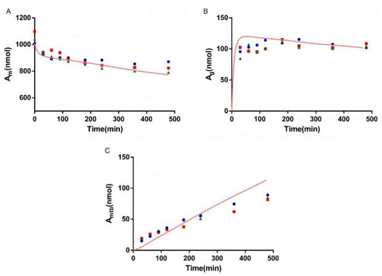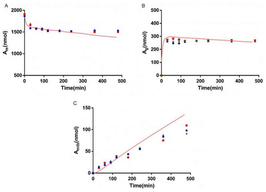 The metabolism of AZT in the Bio-PK system at three concentration levels (500 μM, 1 mM and 2.5 mM) was investigated, and the CLg was fitted using the MATLAB mathematical model. The fitting curves are shown in Figure 6, Figure 7 and Figure 8. The CLg was divided by the protein concentration of the microsomes to obtain the CLint values, which were 29, 25 and 21 μL/min/mg at 500 μM, 1 mM and 2.5 mM, respectively. The average value was calculated (25 μL/min/mg) and applied as the input value in the PBPK models. In addition, the non-metabolic loss rate of AZT in the system was also estimated based on changes in the amount of AZT and AZTG over time. The results are shown in Table 4. The recovery rates were above 85%, indicating that the non-metabolic loss of AZT in the Bio-PK system was acceptable and reliable.