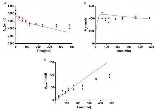 The simulated amount–time curve of AZT in circulating mixture (A), hydrogel (B) and the simulated amount–time curve of AZTG (C) produced in the system at 2.5 mM. Dots (n = 3): experimental data from the Bio-PK system.